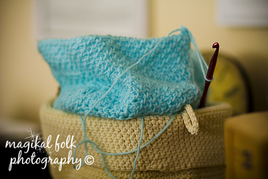 There has been a little progress…my project sitting on top of the yarn in one of my little Ikea baskets.  I guess I could have tidied up the yarn a bit before I took this.  😐