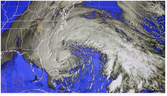 Outside my window…is a dreary, rainy, windy, chilly, miserable morning. Yup, I think that about covers it. We are awaiting the arrival of Hurricane Sandy sometime tomorrow but because the storm is so huge, we are getting a taste of what is to come for now. The rain started late yesterday afternoon….the wind began about that time too. It rained all night….not torrential downpours, just a steady rain…and the wind really picked up the pace sometime in the early morning hours. Right now, at 9:00 Sunday morning, it is 59°F and the winds are at 19 mph, gusting to 32 mph from the northeast. The front that moved across the country earlier this week is expected to weaken which will allow Sandy to come ashore. Combine those two with a cold air mass from the north…you have a perfect storm….and oddly enough on these events are occurring about the same time as the other perfect storm that formed on October 28th, 1991. This type of event is considered worse than a hurricane because they normally last maybe a day…this is expected to last until Wednesday morning when the skies will began to clear in our area…a total of three days and four nights of rain and wind. Fortunately our lowest predicted temperature is 39°F Tuesday evening so this should only be a rain event for us. The worst of the weather will happen tomorrow…this is how it looked last night {image credit: The Weather Channel} ~