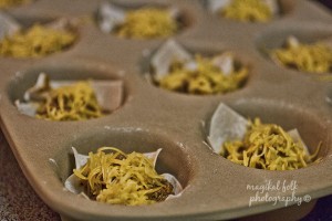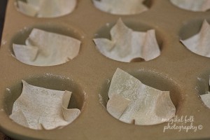 From my kitchen…is a recipe that is so ridiculously easy and tasty you will love it….Taco Cups. I can’t remember where I got this idea from but it is great for a quick dinner or snack. Here it is….brown and season the taco meat….place won ton wrappers in a muffin pan like so…